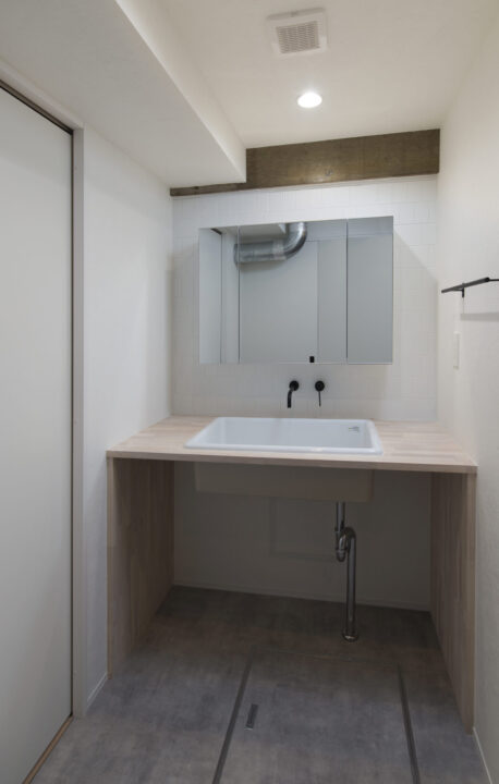 木のカウンターに実験用シンクのような洗面ボウルを組み合わせた印象的な造作洗面。毎朝の支度が少し特別になる、心地よい空間