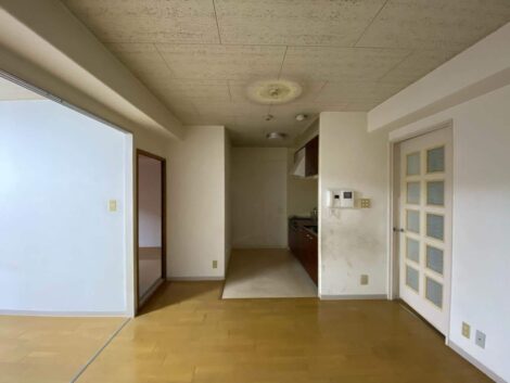 コンクリート躯体をあらわにした天井と、やさしい色合いの無垢フローリング。素材感を楽しめる大人のリビング空間