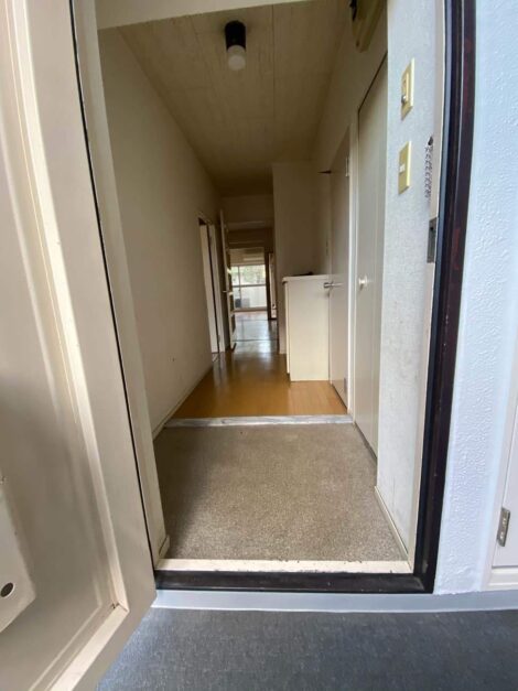 土間から続くオープン棚が印象的な玄関スペース。靴やアウトドア用品、日用品までスマートに収められ、出かける動線もスムーズに