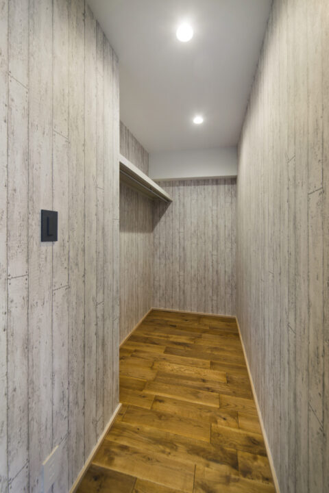 木目調クロスで仕上げたウォークインクローゼット。衣類や季節物の収納もたっぷり可能で生活感を見せずにすっきり片付くのが魅力